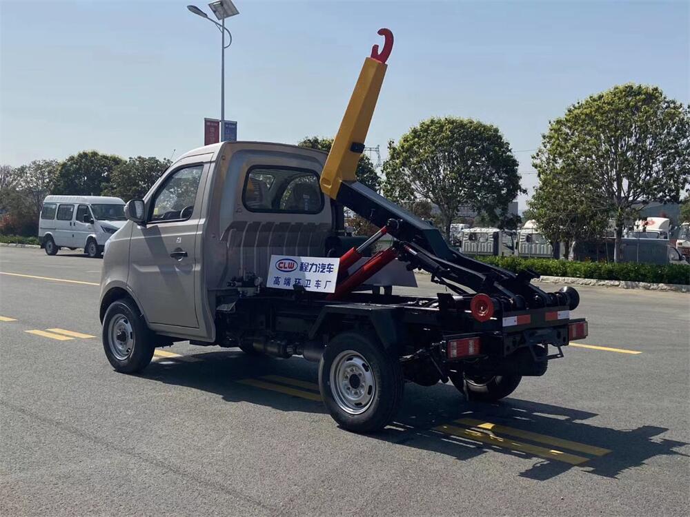 該款鉤臂式垃圾車由液壓系統、操作系統組成。舉升油制缸(1支)系國內知名液壓件廠家生產的雙作用油缸。垃圾廂可自吊上放下,可自行傾倒垃圾,上下一次工作循環時間≤50S。該車的特點是一個車能配多個垃圾廂,能實現一臺車與多個垃圾廂聯合作業,循環運輸,充分提高了車輛的運輸能力。
