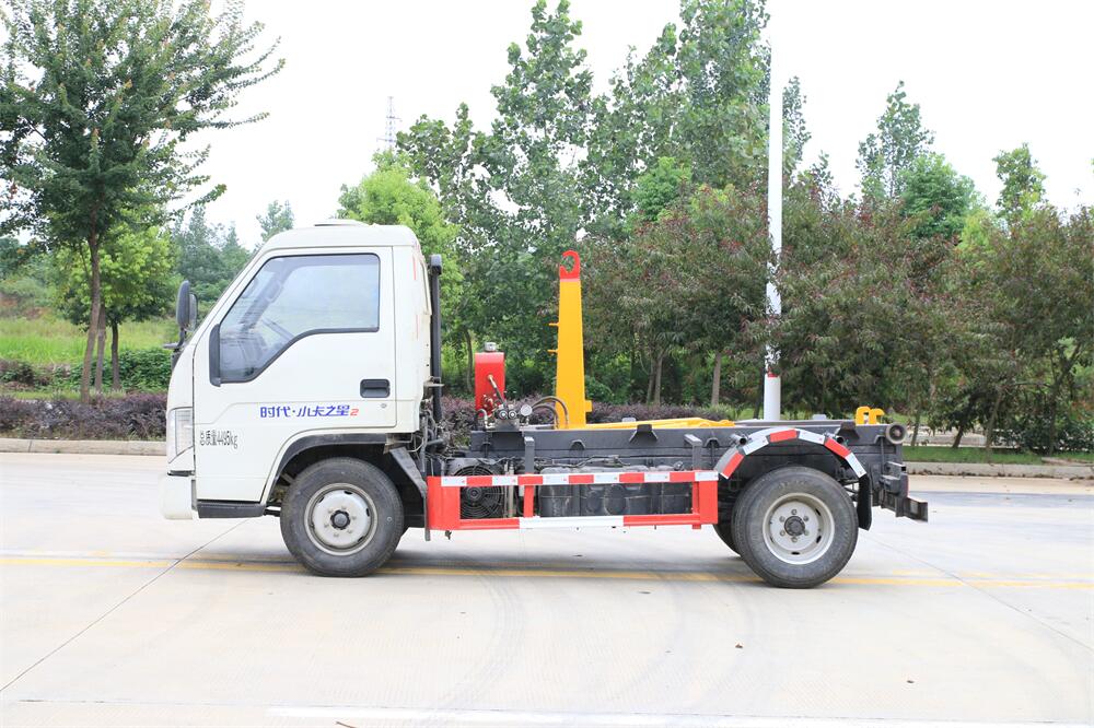 該款鉤臂式垃圾車由液壓系統(tǒng)、操作系統(tǒng)組成。舉升油制缸(1支)系國內(nèi)知名液壓件廠家生產(chǎn)的雙作用油缸。垃圾廂可自吊上放下,可自行傾倒垃圾,上下一次工作循環(huán)時間≤50S。該車的特點是一個車能配多個垃圾廂,能實現(xiàn)一臺車與多個垃圾廂聯(lián)合作業(yè),循環(huán)運(yùn)輸,充分提高了車輛的運(yùn)輸能力。