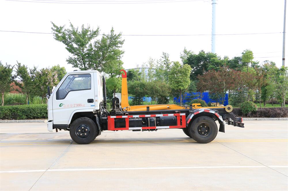 勾臂式垃圾車(車廂可卸式垃圾車)介紹: 車廂可卸式垃圾車又叫拉臂式垃圾車,是一種采用高新設(shè)計(jì)可伸縮的鉤臂,實(shí)現(xiàn)垃圾廂的二次吊裝,自吊上放下,可自行傾倒垃圾的環(huán)衛(wèi)設(shè)備。 拉臂式垃圾車結(jié)構(gòu)簡單,操作穩(wěn)定方便,裝卸效率高,機(jī)械化程度高,節(jié)省人力。鉤臂垃圾車一車可帶多個(gè)垃圾廂,在裝卸的運(yùn)輸過程中可有效地避免二次污染。 拉臂垃圾車采用高新設(shè)計(jì)可擺動的鉤臂,垃圾箱由框架、開啟油缸、滑輪、后門和若干加強(qiáng)框架與鋼板焊接而成。調(diào)換貨廂快捷方便,貨廂上帶蓋(倒垃圾時(shí)可翻開),鉤臂垃圾車?yán)鴰w可選用碳鋼、不銹鋼材質(zhì)、內(nèi)部采取環(huán)氧樹脂防腐處理,改裝部分與原車底盤為可分離式,維修方便且保持了原車的機(jī)動性及行駛性能。