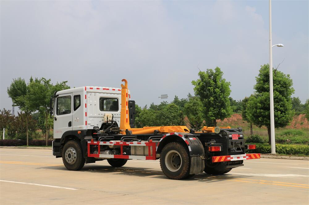 該款鉤臂式垃圾車由液壓系統、操作系統組成。舉升油制缸(1支)系國內知名液壓件廠家生產的雙作用油缸。垃圾廂可自吊上放下,可自行傾倒垃圾,上下一次工作循環時間≤50S。該車的特點是一個車能配多個垃圾廂,能實現一臺車與多個垃圾廂聯合作業,循環運輸,充分提高了車輛的運輸能力。