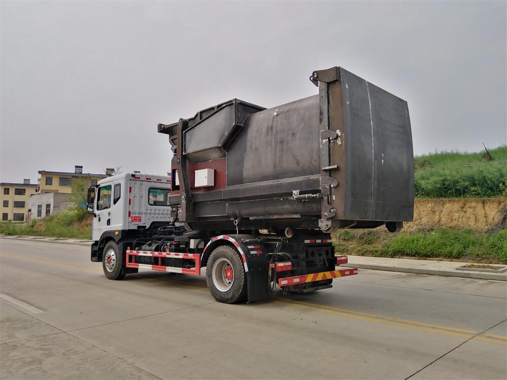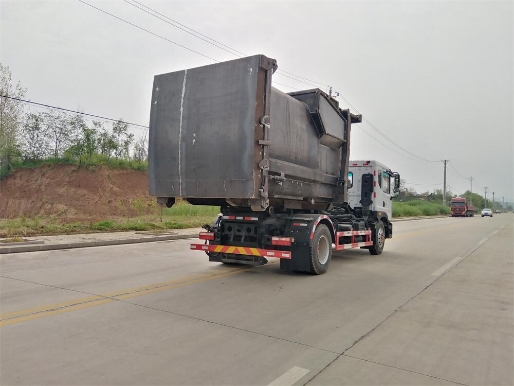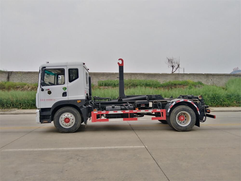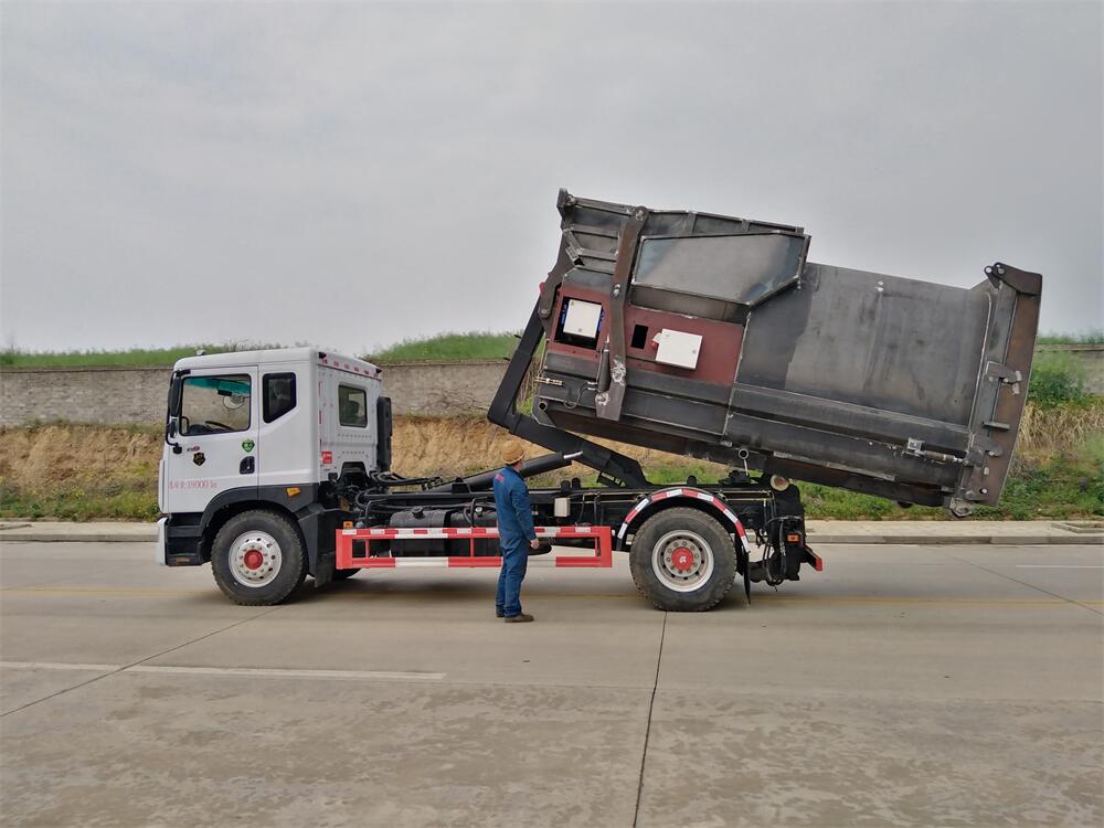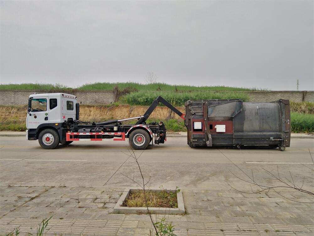 勾臂式垃圾車(車廂可卸式垃圾車)介紹: 車廂可卸式垃圾車又叫拉臂式垃圾車,是一種采用高新設(shè)計(jì)可伸縮的鉤臂,實(shí)現(xiàn)垃圾廂的二次吊裝,自吊上放下,可自行傾倒垃圾的環(huán)衛(wèi)設(shè)備。 拉臂式垃圾車結(jié)構(gòu)簡單,操作穩(wěn)定方便,裝卸效率高,機(jī)械化程度高,節(jié)省人力。鉤臂垃圾車一車可帶多個(gè)垃圾廂,在裝卸的運(yùn)輸過程中可有效地避免二次污染。 拉臂垃圾車采用高新設(shè)計(jì)可擺動(dòng)的鉤臂,垃圾箱由框架、開啟油缸、滑輪、后門和若干加強(qiáng)框架與鋼板焊接而成。調(diào)換貨廂快捷方便,貨廂上帶蓋(倒垃圾時(shí)可翻開),鉤臂垃圾車?yán)鴰w可選用碳鋼、不銹鋼材質(zhì)、內(nèi)部采取環(huán)氧樹脂防腐處理,改裝部分與原車底盤為可分離式,維修方便且保持了原車的機(jī)動(dòng)性及行駛性能。