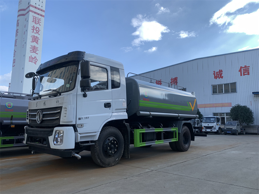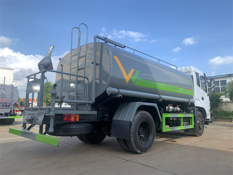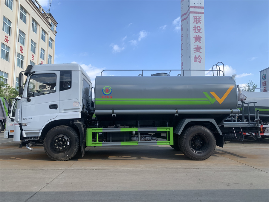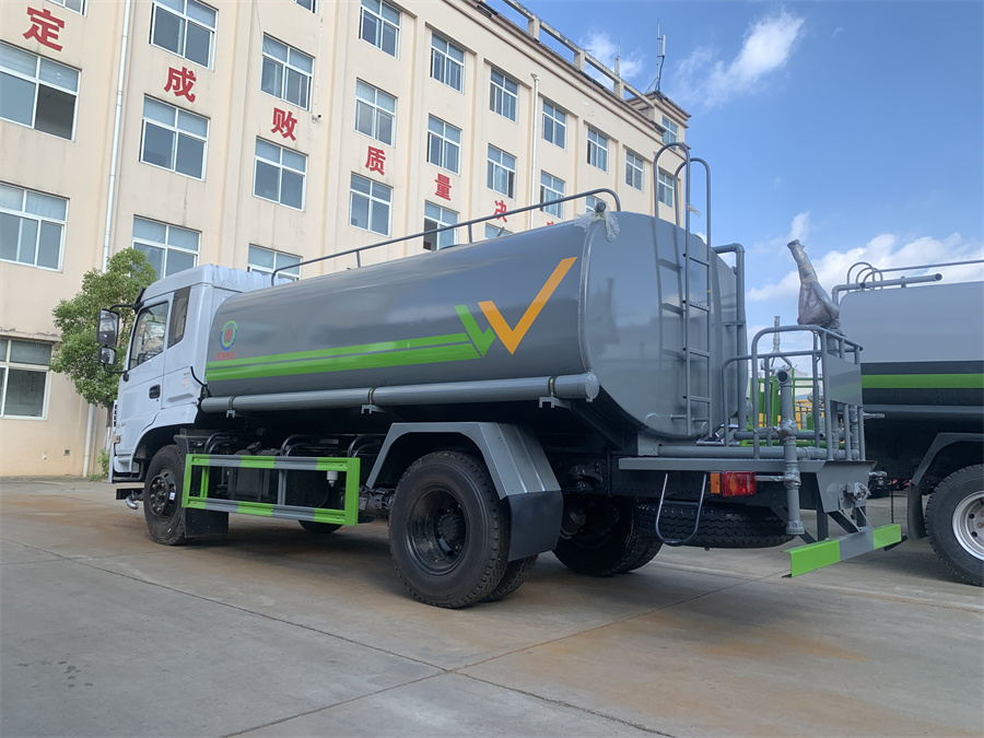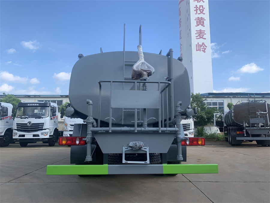 灑水車前裝有鴨形噴嘴或圓頭沖嘴,后面裝有圓柱開(kāi)灑水噴嘴或蓮蓬頭噴嘴,后部有一工作平臺(tái),裝配有水炮。后部還可裝8個(gè)噴嘴(選裝)。