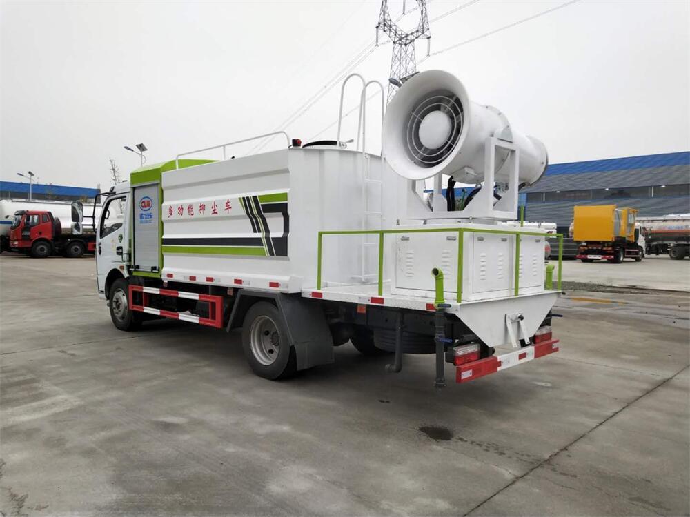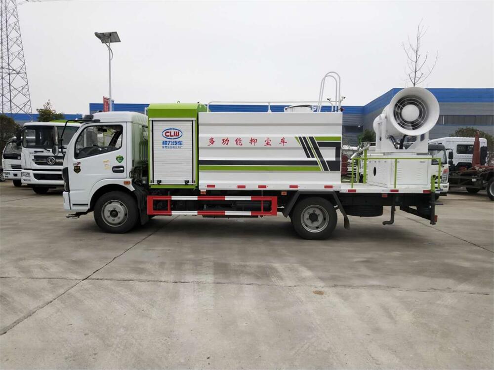 上裝配置:罐體容積為 8立方,選配風送式霧炮機組射程30米、40米、50米、60米、80米、100米、120米霧炮,罐體鋼板為4mm碳鋼Q235材質,罐內隔板具有防波作用,以減輕汽車行駛時罐體液體沖擊,罐體及整車外形尺寸按照公告。帶大功率專用灑水泵,泵可自吸自排,整車前沖、后灑、側噴、帶65消防接口,后平臺配CLW-50、CLW-60、CLW-80、CLW-100、CLW-120型風送式霧炮機組;罐體前封頭配大功率柴油發電機組;前封頭帶水位計,后平臺主管路帶1寸澆花接口,后爬梯。帶兩根輸水管及陰陽端。罐體顏色:銀/灰/綠,罐體兩側噴“多功能抑塵車”字樣,貼反光標示。