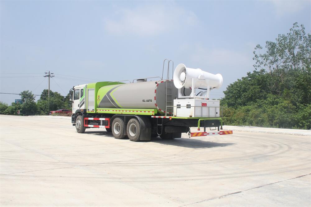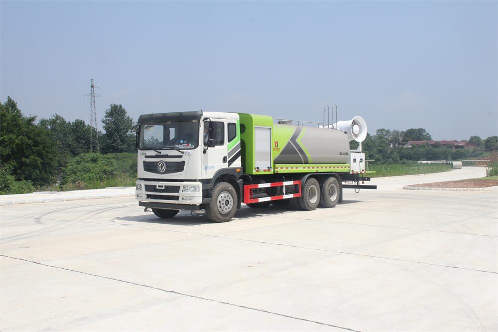 上裝配置:罐體容積為 16立方,選配風送式霧炮機組射程30米、40米、50米、60米、80米、100米、120米霧炮,罐體鋼板為4mm碳鋼Q235材質,罐內隔板具有防波作用,以減輕汽車行駛時罐體液體沖擊,罐體及整車外形尺寸按照公告。帶大功率專用灑水泵,泵可自吸自排,整車前沖、后灑、側噴、帶65消防接口,后平臺配CLW-50、CLW-60、CLW-80、CLW-100、CLW-120型風送式霧炮機組;罐體前封頭配大功率柴油發電機組;前封頭帶水位計,后平臺主管路帶1寸澆花接口,后爬梯。帶兩根輸水管及陰陽端。罐體顏色:銀/灰/綠,罐體兩側噴“多功能抑塵車”字樣,貼反光標示。