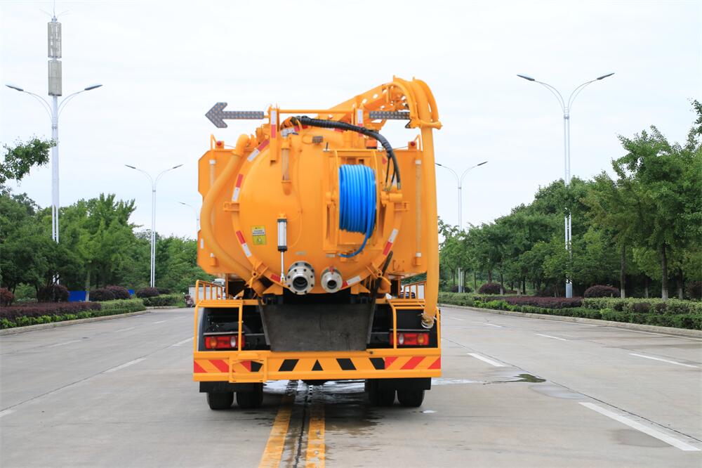 上裝配置:清水罐約 5 立方,污水罐約 10 立 方;罐體 8mm 厚,封頭 8mm 厚,水罐、污罐可 互通,用 100 球閥**開關;清洗部份采用天 津通潔高壓泵,壓力 19Mpa,流量 215L/min, 配 80 米直徑 22 高壓管帶液壓卷盤;吸污部份 采用濰柴375馬力副發動機帶山東SK-30水循 環泵(副發自帶),吸污罐帶舉升,后封頭焊 死(可選擇后封頭全開),尾部加裝一個 600mm 快開,罐體后尾部一個 DN150 排污口球閥,一 個 DN100 吸污球閥帶出口盤,一個視污窗,一 根 10m 吸污管,一套陰陽端,壓力表,防溢 閥,箭頭燈,工具箱,淋管裝置,高壓泵帶氣 吹水。配一個 4.5 公斤水雷噴頭,另帶一個 80 公分手持洗車噴頭。
