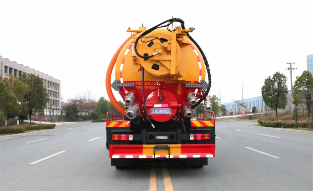 上裝配置:罐體容積為 22 立方(水污可自由 分配),罐體 8mm 厚,封頭 8mm 厚,水罐、污 罐可互通,用 100 球閥**開關;清洗部份采 用品孚高壓泵,壓力 20Mpa,流量 330L/min, 配 80 米直徑 25 高壓管帶液壓卷盤;吸污部份 采用濰柴420馬力副發動機帶山東SK-42水循 環泵(副發自帶),吸污罐帶舉升,尾部加裝 一個 600mm 快開,罐體后尾部一個 DN150 不銹 鋼排污口,一個 DN150 不銹鋼偷排,兩個 DN100 吸污球閥帶出口盤,一個視污窗,兩根 10m 吸 污管,一套陰陽端,壓力表,防溢閥,箭頭燈, 工具箱,淋管裝置,高壓泵帶氣吹水,配一個 9 公斤水雷噴頭,另帶一個 80 公分手持洗車 噴頭。